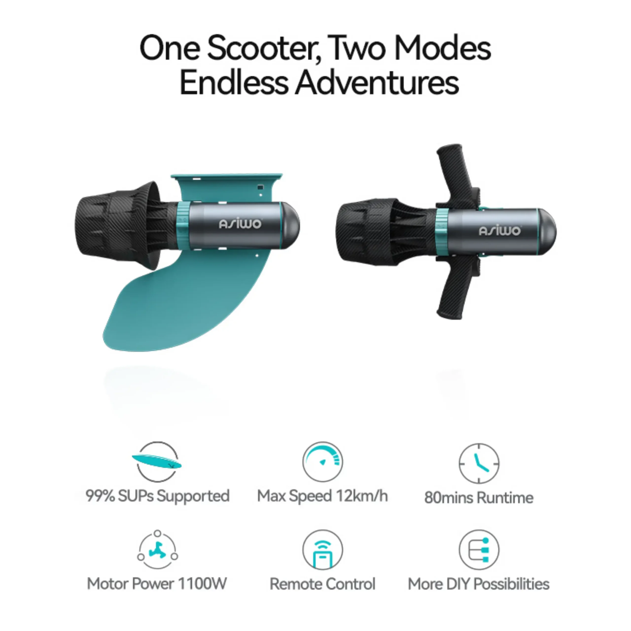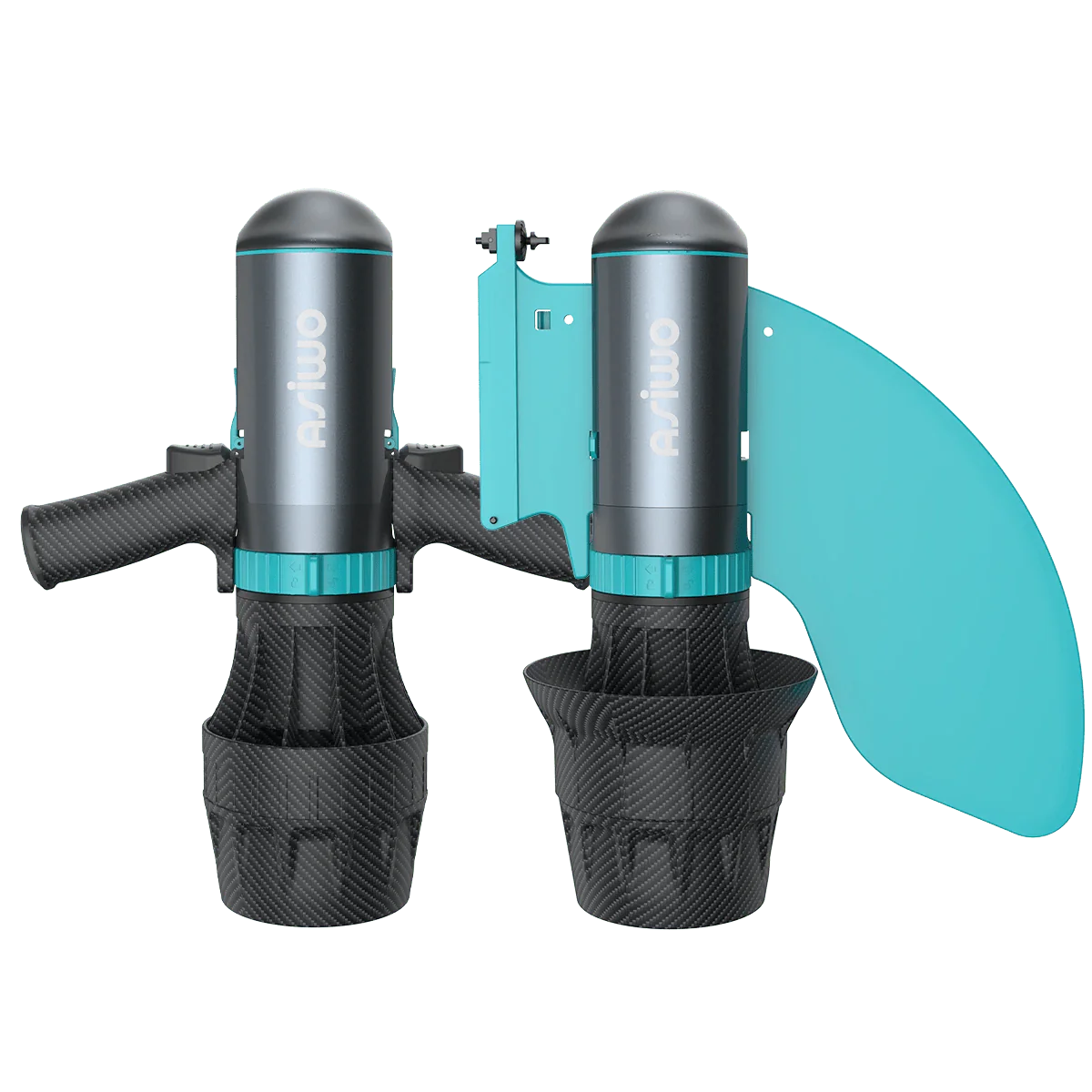 The Asiwo U1 is the most versatile model in the lineup, functioning as a “2-in-1” hybrid. It is designed to work both as a handheld sea scooter and as an electric motor for paddleboards or kayaks.
